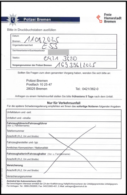 Am 11.08.2025 hat die Polizei Bremen am Ziegenmarkt erneut meine Strafanzeige aufgenommen mit dem Hinweis auf meine Webseite www.unfallmann.de und Tatvorwurf: Prozessbetrug.