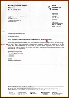 und wollte - wie ich - die Mediation. Aber das Sozialgericht ist "Herr des Verfahrens" und hat es zu keiner Mediation kommen lassen.