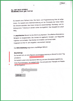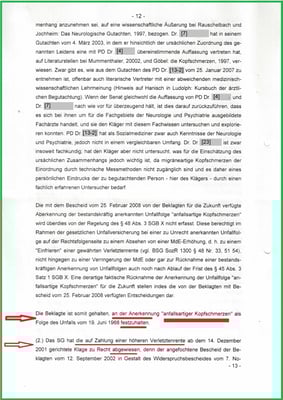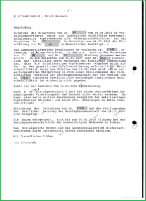 Und hat dazu mit Schreiben vom 02.11.2007 bei Dr. Dr. [23] eine Stellungnahme vom 28.11.2007 anfertigen lassen. Mit dem Ziel, dass meine mit Bescheid am 12.09.2002 anerkannten "anfallsartigen Kopfschmerzen" als Unfallfolge aufgehoben wird. Und verhindert, dass weitere folge Unfälle als mittelbare Unfallfolgen erkannt werden. Herr [18] war von mir bei meiner letzten Akteneinsicht am 09.06.2009 als "Betrüger" erkannt und benannt worden. Diese Anschuldigung halte ich aufrecht und habe Herrn [18] dazu im Einklang ein Gesicht und Boxhandschuhe verpasst. Das Urteil hat am 18.12.2008 als Teilerfolg bestätigt, die Runde hat Herr [18] und die BGHW verloren.