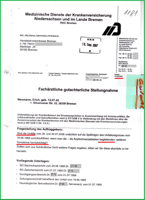 Meine Unfallfolgen haben die Mediziner meiner zuständigen Berufsgenossenschaft Handel und Warenlogistik (BGHW) im Verwaltungsverfahren diagnostiziert. Von der BGHW wurde auch meinen Stromunfall in der Medizintechnik (20.03.2001) als Arbeitsunfall mit Bescheid vom 27.04.2004 anerkannt.