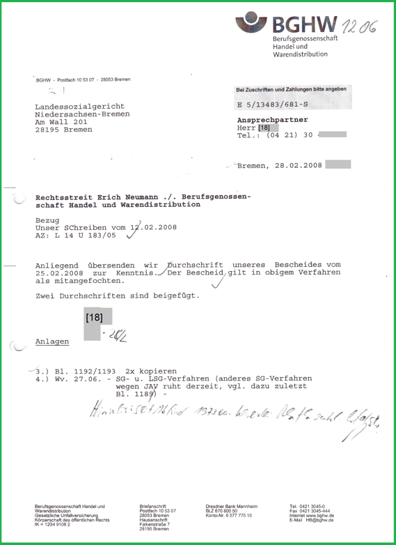 Ferner kommt nun das interne Schreiben der BGHW Bremen vom 05.10.2009 (drei Seiten) ins Blickfeld. Denn mit Bezug auf das Schreiben vom 05.10.2009 kam die BGHW Hauptverwaltung mit dem Schreiben vom 19.10.2009 zu dem wörtlichen Ergebnis: