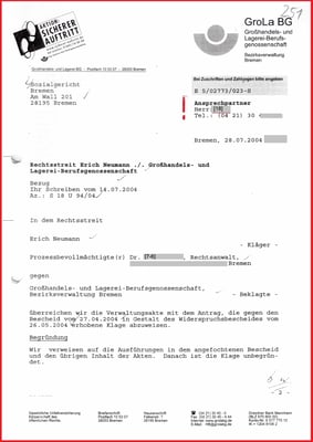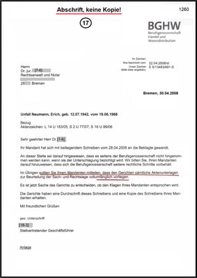 "Der Unterzeichner unterbreitete Herrn Neumann Rahmen der Akteneinsicht das Angebot, dass ihm alle Aktenunterlagen, die wesentlich sind (also keine Rechnungen usw.), nochmals zur Verfügung gestellt werden (die Unterlagen in der Handakte sind ausdrücklich von den Kopien ausgenommen!). Das sei ein Entgegenkommen der BGHW, das nicht selbstverständlich ist."