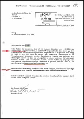 Mit meinem Schreiben vom 08.05.2008 habe ich auf das Schreiben der BGHW vom 25.04.2008 und auf das Schreiben meines Anwalts vom 05.05.2008 reagiert. Und auf der Rückseite von Blatt 4, hat der Geschäftsführer Herr [20-2] am 15.05.2008 festgesetzt, eine Rechtfertigung soll es nicht geben.
