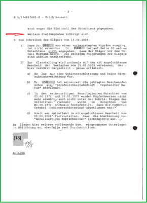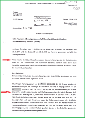 Mit dem folgenden Schriftsatz vom 14.05.2008 hat die Beklagte eine unvollständige und unrichtige Stellungnahme dem Gericht vorgelegt und die von mir angezeigten Manipulationen, weist die Beklagte entschieden zurück. Dazu im Einklang will die Beklagte meine mit Bescheid anerkannten "anfallsartigen Kopfschmerzen" als Unfallfolge ablehnen und wäre nur durch Manipulation möglich. Das Gericht ist der Beklagten nicht gefolgt, wie das Urteil aus dem LSG Bremen vom 18.12.2008 bestätigt und war ein Teilerfolg im Kampf um Unfallrente.