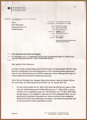 Die folgende Stellungnahme ist als Verstoß gegen § 200 Abs. 2 Hs. 1 SGB VII erkannt und sollte mit Schreiben der BGHW vom 04.04.2017 aus der Akte entfernt werden. Es war ein Teilerfolg im Kampf um Unfallrente.