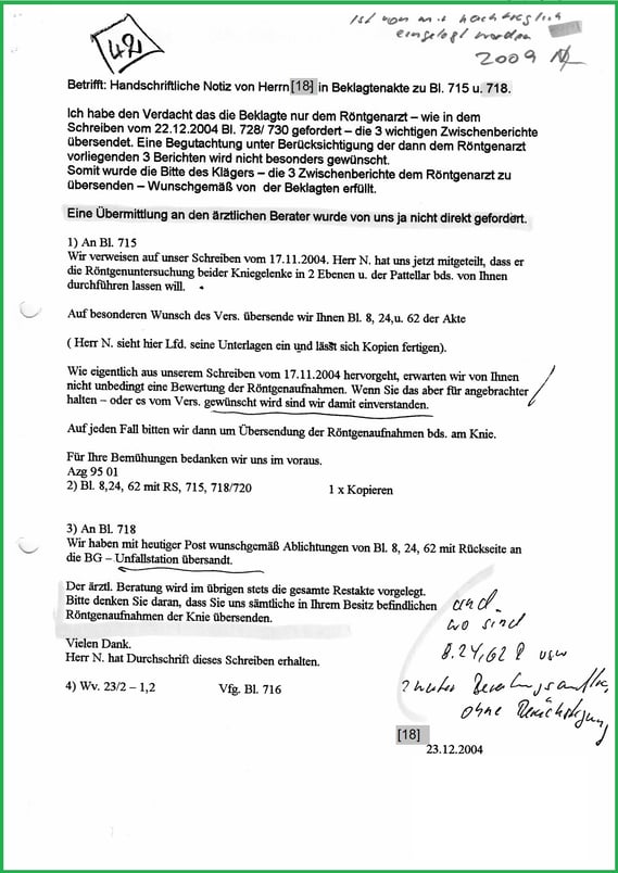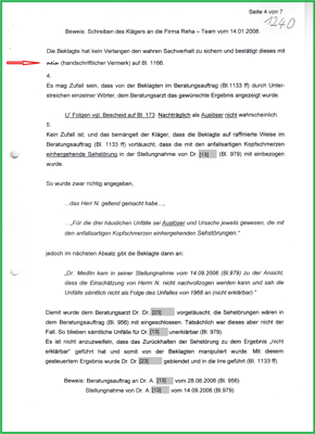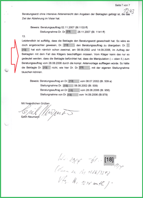 Davon durfte der Kläger und sein Prozessbevollmächtigter aber nichts erfahren. Und so wurde der Schriftsatz der Beklagten vom 28.02.2005 (Bl.270) mit den Anlagen in Kopie nicht an den Kläger und seinem Prozessbevollmächtigten weitergeleitet, sondern nur an den Gerichtsgutachter. Siehe 26.08.2009 mein Anwalt deckt Prozessdelikt auf.