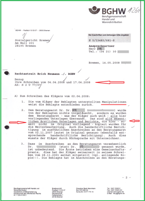 Nach der Gesprächsnotiz (15.04.2008) kam mit dem Hinweis auf mein Schreiben vom 14.04.2008 das Antwortschreiben von dem Geschäftsführer der BGHW Herrn [20-2]. Und wurde am 13.08.2019 zur Geheimhaltung von der BGHW unter der Nr. 2 festgesetzt. Denn die Beklagte folgt nicht den Einschätzungen der Gutachter und verliert ihr Ansehen, wenn dieses Schreiben an die Öffentlichkeit kommt.