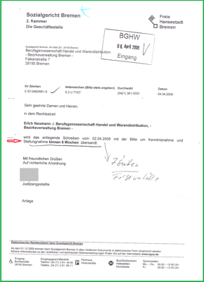 Mit dem Schreiben vom 30.04.2008 hat die Beklagte (BGHW) meinen Anwalt wie folgt aufgefordert: