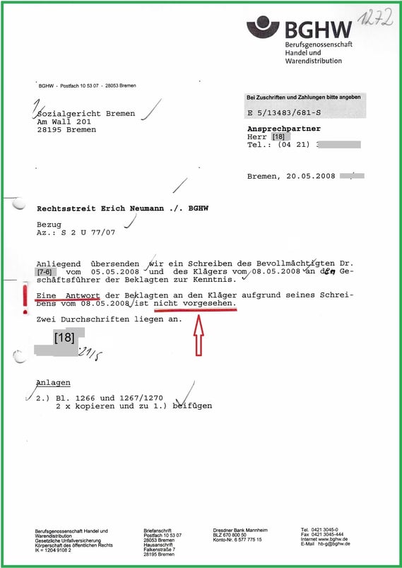 Mit der Gesprächsnotiz (15.04.2008) dem Vermerk auf der noch folgenden Verfügung vom 15.05.2009 ist gesichert, der Geschäftsführer der BGHW Herr [20-2] will keine Aufklärung über die wahre Sach-und Rechtslage. Diese Tatsache wurde auch meinem Aktenbearbeiter und Prozessbevollmächtigten der BGHW Herrn [18] bekannt gemacht.