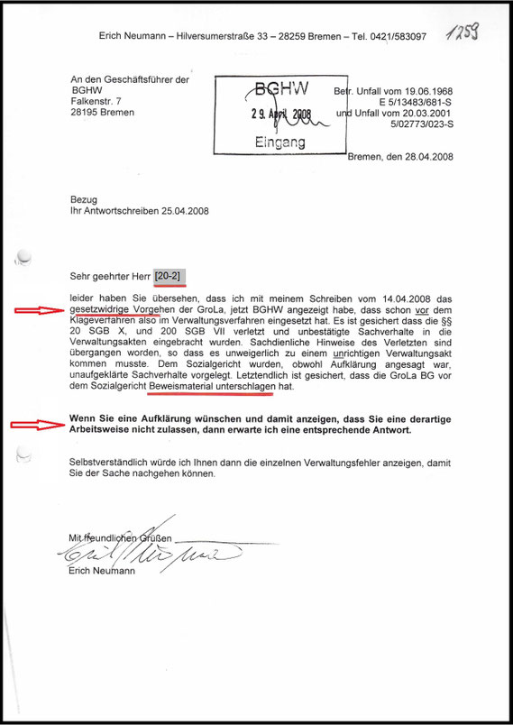 Mit meinem Schreiben vom 08.05.2008 habe ich auf das Schreiben der BGHW vom 25.04.2008 und auf das Schreiben meines Anwalts vom 05.05.2008 reagiert. Und auf der Rückseite von Blatt 4, hat der Geschäftsführer Herr [20-2] am 15.05.2008 festgesetzt, eine Rechtfertigung soll es nicht geben.