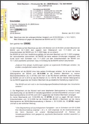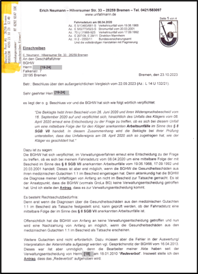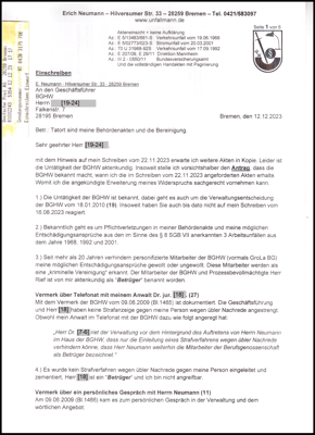 Nun wurde nachvollziehbar, Juristen und Richter/innen also die "Elite nach 1945" haben meinen Fall bearbeitet. Und die Elite am Sozial/Landessozialgericht Bremen wird sich weiter um meinen Fall kümmern, wenn die Beklagte Berufsgenossenschaft (BGHW) keine vollständige Aufklärungsarbeit im Verwaltungsverfahren durchführt. So wird es auf meinem folgenden Schreiben vom 12.12.2023 nachvollziehbar dokumentiert.