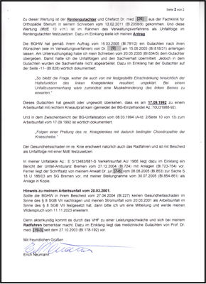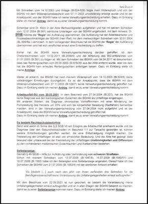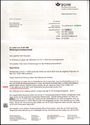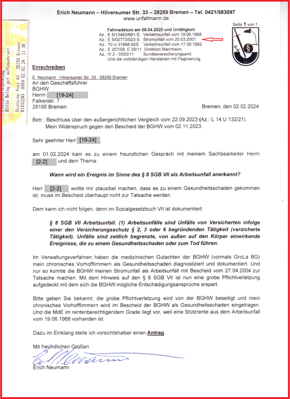 Ob es sich bei diesem Unfall um eine mittelbare Folge der für den Kläger anerkannten drei Arbeitsunfälle im Sinne des § 8 SGB VII handelt, hat die BGHW überhaupt Ermittelt und so hat die BGHW auch nicht die zwei anerkannten Arbeitsunfälle aus dem Jahre 1992 und 2001 im Bescheid aufgeführt. Mehr dazu in meinem folgenden Widerspruch vom 11.11.2023.