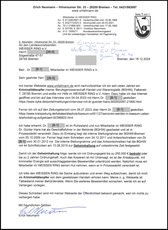 Und wird wahrscheinlich zu einer erneuten Klage vor dem Sozialgericht führen, weil die BGHW keine weitere Aufklärung betreiben wird und aktenkundig schon am 17.11.2009 eine Grenze der Aufklärung gezogen hat. Dazu im Einklang hat die Kriminalpolizei Bremen erkannt, ich kämpfe gegen eine "kriminelle Vereinigung" die niemals Zurückrudern wird und vom Gesetzgeber mit einer Freiheitsstrafe bedroht wird.