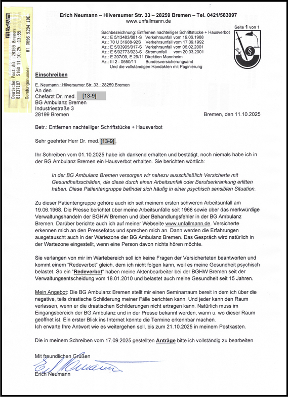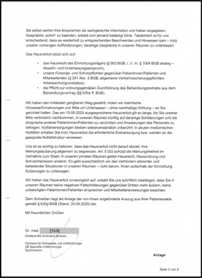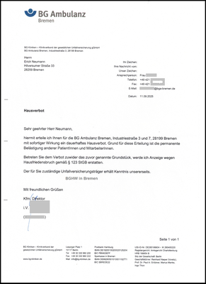 Am 15.09.2025 hat mir der Chefarzt [13-9] der BG Ambulanz Bremen ein schriftliches Hausverbot überreicht, mit dem Hinweis aktenkundig hätte ich schon einmal ein Hausverbot erhalten, der Beleg konnte aber nicht sofort vorgelegt werden und eine weitere Diskussion sollte es nicht geben.